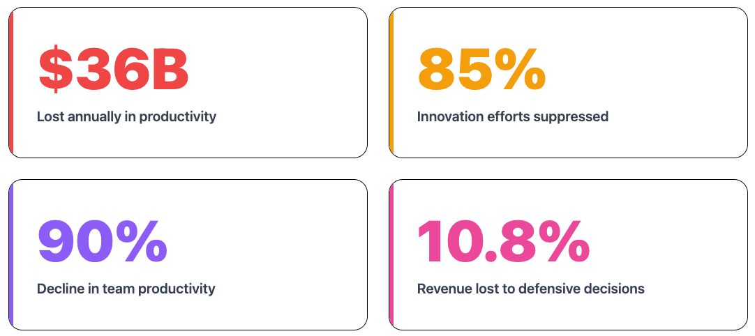 Fear-based management costs organizations $36 billion annually in lost productivity. It suppresses 85% of innovation efforts. Teams operating under fear-driven leaders see 90% declines in productivity, and defensive decision-making costs organizations 10.8% of annual revenue in lost opportunities.