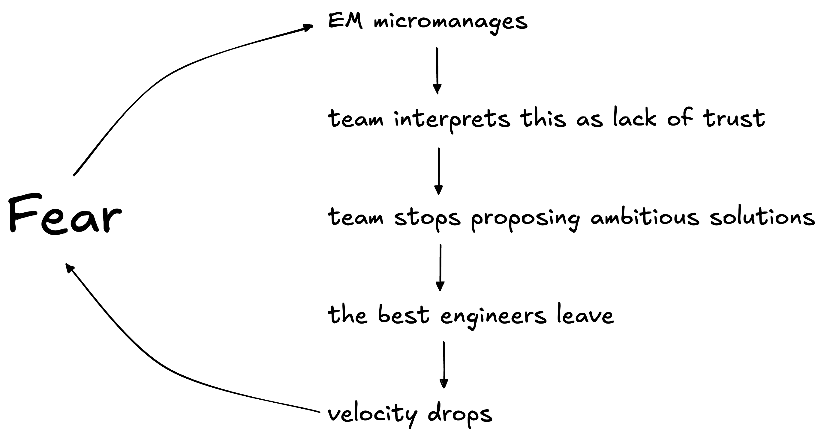 A new engineering manager afraid of losing control starts micromanaging. The team interprets this as lack of trust and stops proposing ambitious solutions. The best engineers leave. Velocity drops. The manager gets scared even more and micromanages harder.